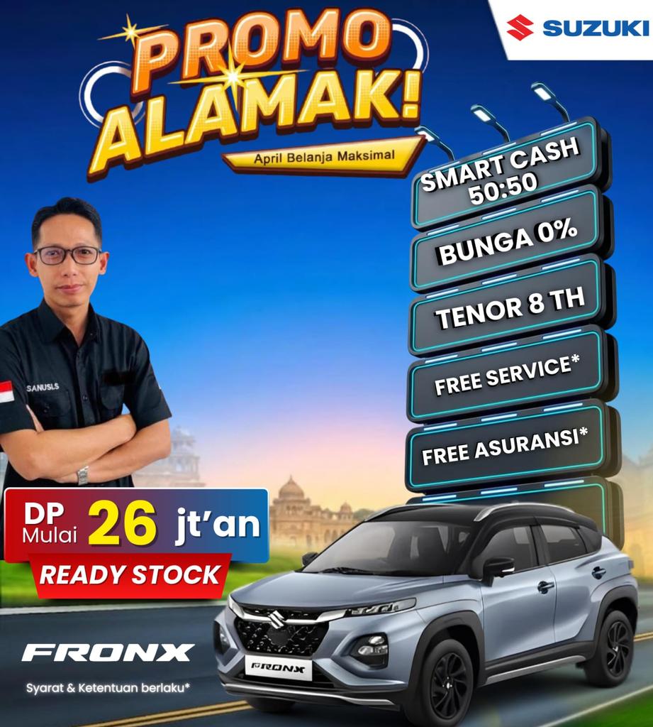 Berkendara dengan mobil berkelas dunia. Promo Suzuki Fronx hadir dengan DP murah dan cicilan rendah.